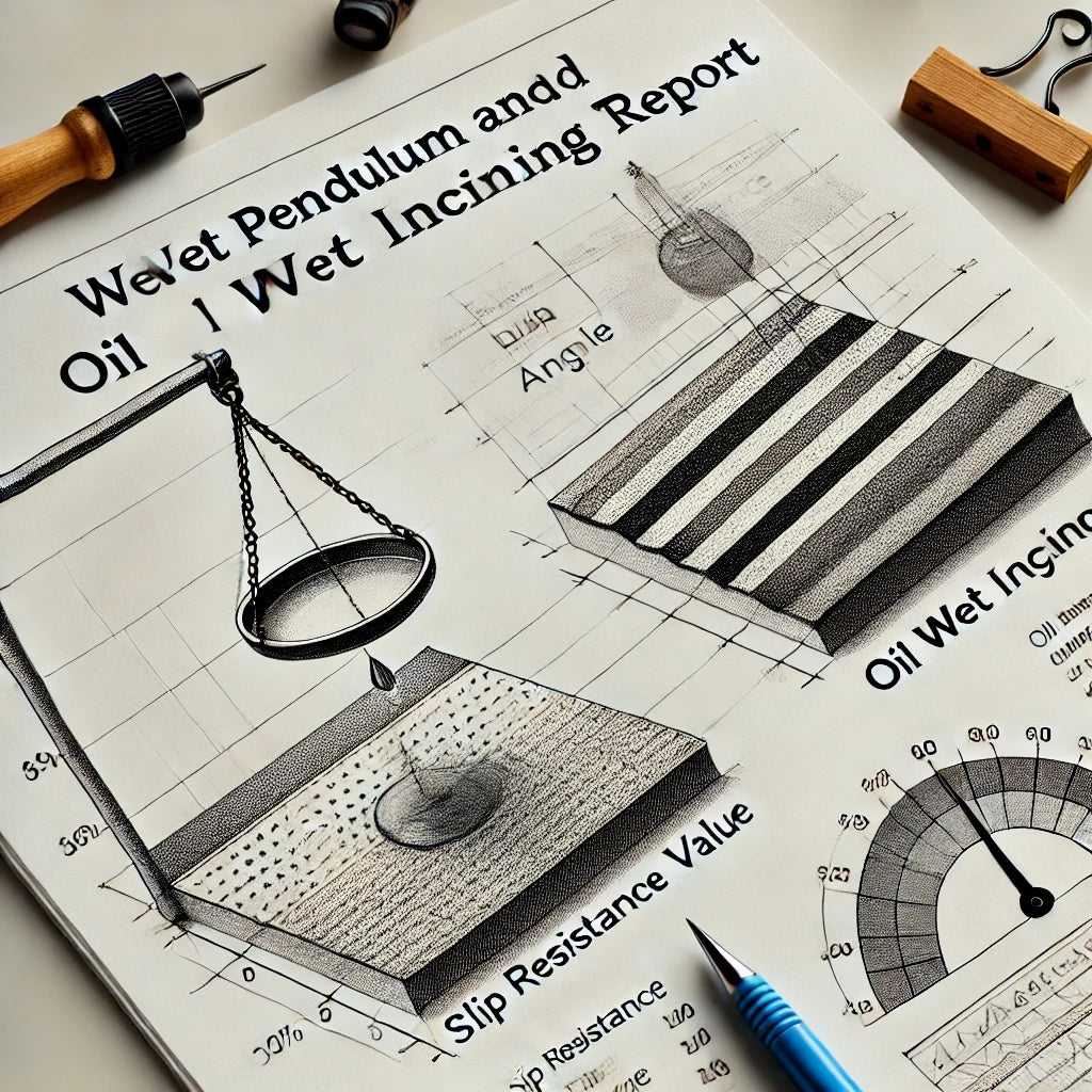Wet Pendulum & Oil Wet Inclining Test Report details the results of slip resistance tests conducted on surfaces under wet and oil-wet conditions, measuring their safety performance using methods like the pendulum test and inclined platform test to ensure compliance with anti-slip standards.
